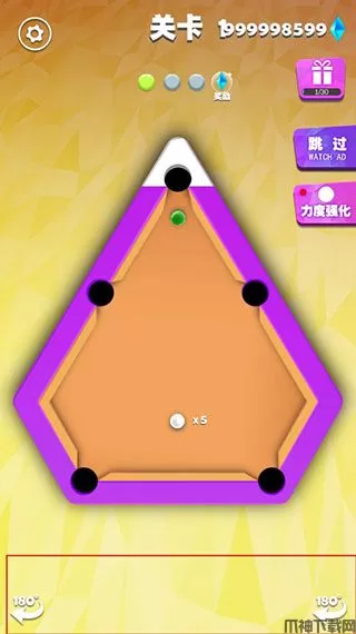 3、关卡种类非常丰富,每一关的台球桌都不一样,每一个难度都是精心设计的,你可以自由的挑战。