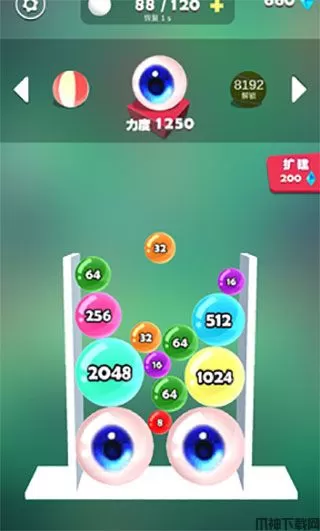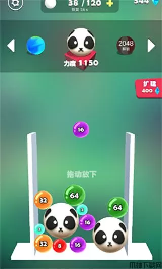 4、点击游戏的右上角的力度,体验2048玩法,依次叠加力度,选择旁边的扩建,还能扩展空间。