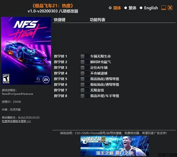 极品飞车21热度修改器是专为同名游戏极品飞车21热度而研发的一款辅助工具软件,由作者“风灵月影”制作,具有车辆无限生命、瞬间补充氮气、降低AI车辆、不会被逮捕、最高热度/车手经验等八项功能,让玩家在游戏中体验不一般的乐趣,感兴趣的朋友不要错