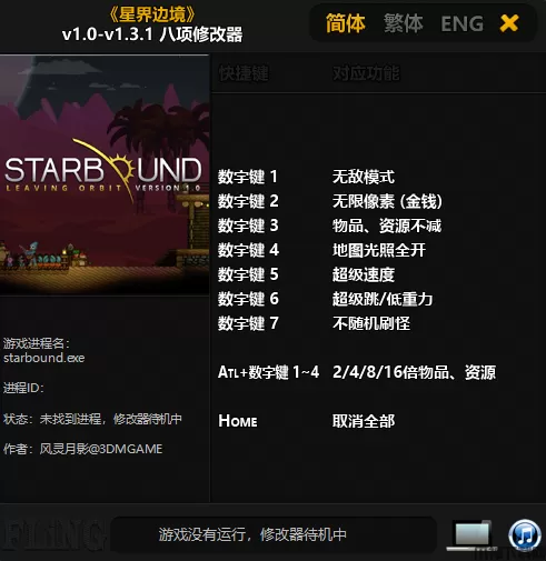 星界边境修改器是一款专用于星界边境游戏的游戏辅助工具,具有无敌模式(包含无限生命、无限体力、无限氧气、满饱腹度等四种效果)、无限金钱、地图光照全开、超级速度等强大功能,可帮助用户更好地进行游戏的体验。