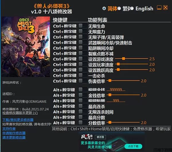 兽人必须死3修改器风灵月影版,该修改器是由大佬风灵月影原创制作而成,可以修改如无限生命、无限魔力、无限子弹多达十八项游戏内容,能够有效降低游戏难度,有需要的朋友欢迎免费下载使用。