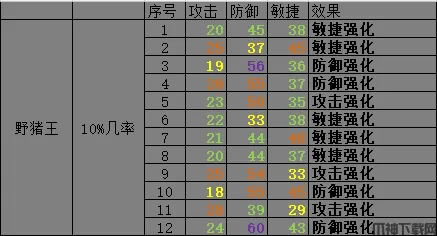 一般情况下只有1条紫色属性,那么如果抓到了 26攻击 60防御 50速度的野猪王,那么你的属性就完美了