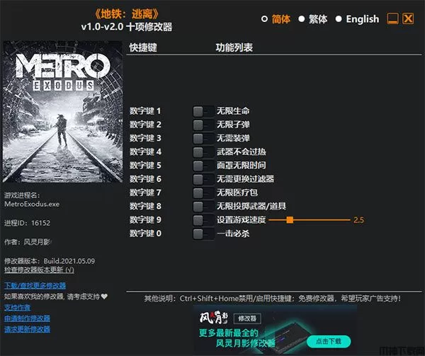 地铁离去修改器是针对大型第一人称射击游戏《地铁:离去》而推出的一款多功能辅助修改工具,它可以帮助玩家对游戏进行修改,如无限生命、无限子弹、无限装弹、无限医疗包等修改功能,助你轻松干掉剧情敌人,完成角色主线任务。