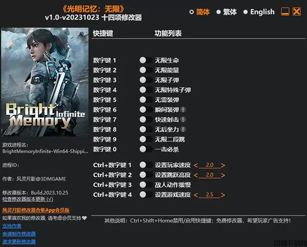 光明记忆无限修改器是一款专为《光明记忆:无限》电脑游戏所打造的游戏辅助工具,它提供了无限生命、无限能量、无限子弹、无需装弹、无后坐力、快速射击等十四项修改功能,可大大降低游戏的操作难度,有需要的玩家欢迎下载使用!