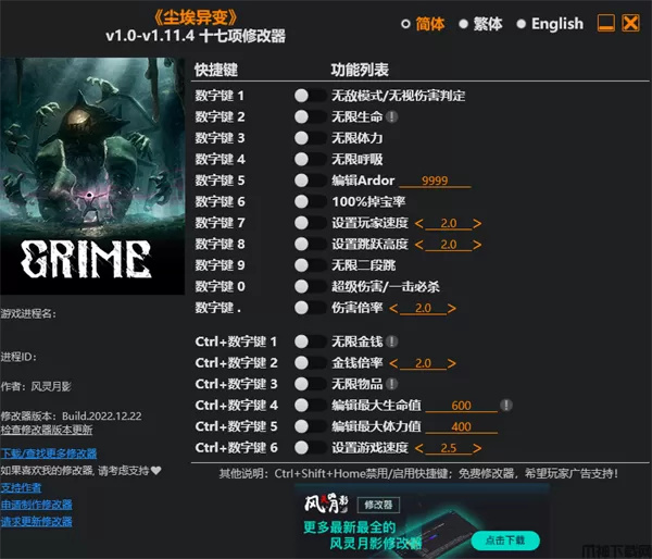 尘埃异变修改器是由风灵月影团队专为《尘埃异变》电脑游戏所打造的游戏辅助工具,它提供了丰富的修改功能,具有无限体力、编辑Ardor、100%掉宝率、设置玩家速度、无限二段跳、金钱倍率、设置游戏速度等辅助功能,能够让玩家在游戏中立于不败之地,更加轻松的通过各种困难的关卡。