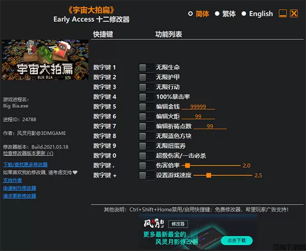 宇宙大拍扁修改器是由风灵月影专为《宇宙大拍扁》电脑游戏所打造的游戏辅助工具,拥有载具无限生命、无限护甲 、无限行动、100%暴击率、编辑金钱、编辑火炬等十二项修改功能,能够减少游戏难程度,带给玩家更好的游戏体验。需要这款修改器的玩家快来本站下载吧!