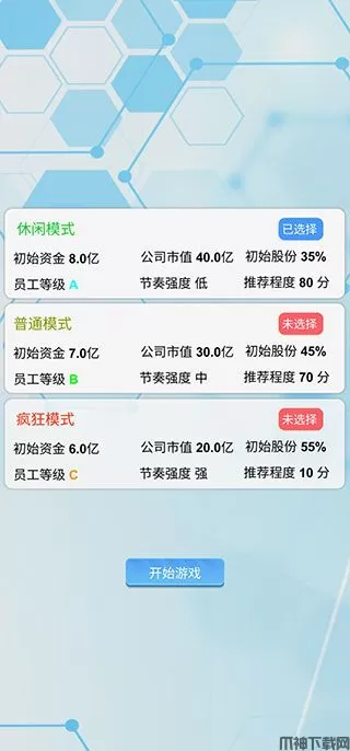 2、游戏开局模式为三种,休闲模式-普通模式-疯狂模式,主要就是初始资金,初始市场和股份的多少还有就是开局员工等级不同,从易到难依次为BCD。