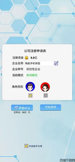 3、小编以休闲模式为例,注册新公司的名称和自己的性别,初始资金8亿。