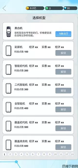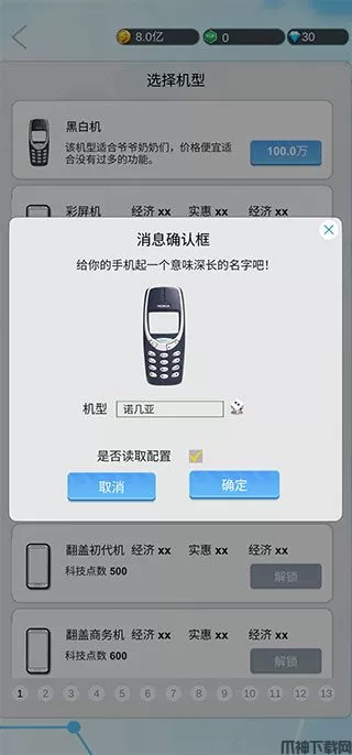 5、初始等级只能选择黑白机,后期升级不断解锁,还可以选择彩屏机、智能机以及翻盖商务机等时尚机型。