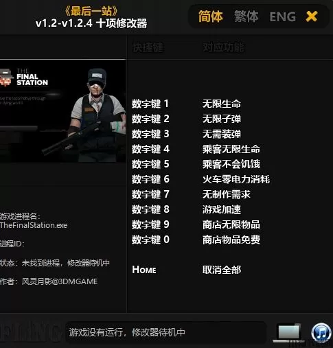最后一站修改器是专为末世冒险类游戏《最后一站》所制作的一款游戏辅助修改工具,它由风灵月影制作,内置简体中文、繁体中文、英文三种语言界面,并且此修改器功能强大,便捷实用,能够让玩家一键实现开启乘客不会饥饿、商店物品免费、无限生命、火车零电力消