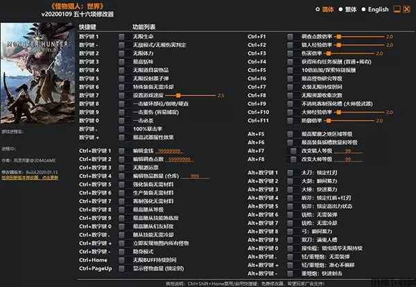 怪物猎人世界是由CAPCOM利用MT Framework引擎开发的一款动作冒险游戏,该游戏作为一个无缝连接的开放世界游戏,将拥有原汁原味的怪猎水平,且游戏将有传统的单人模式,以及联机合作模式。而怪物猎人发生了诸多进化,玩法与画面都有非常巨大的进步,游戏最多支持16人联机社区,4人联机狩猎。在游戏中玩家将扮演一位猎人,需要探索一片新发现的神秘土地,关于这片土地人们知之甚少,所以将这片大陆称为“新世界”。由于游戏难度较大,所以本次小编为大家分享的是怪物猎人世界修改器,该修改器游侠制作组专门针对怪物猎人世界冰原制作的游戏辅助,修改器界面简洁明了,使用方便快捷,玩家只需启动游戏打开修改器即可,玩家可根据自身的需求进行修改属性,利用该修改器玩家可以修改无限生命、无限体力、一击重伤、一招致命、100%暴击率等五十六项功能,帮助你获得更好的畅玩游戏,有喜欢这款游戏的玩家那么千万不要错过这款修改器,快快到本站下载体验吧。