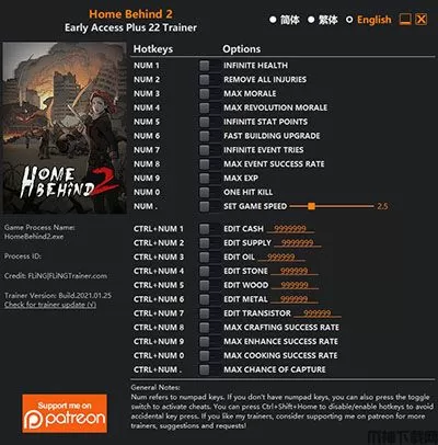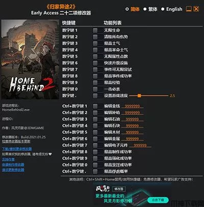 归家异途2二十二修改器是由风灵月影团队倾力打造的一款游戏修改辅助工具,这款修改器专为steam版本的《归家异途2革命》设计研发,能够为用户提供超多实用修改功能,包含有无限生命、清除所有伤势、最高士气、最高革命士气、无限属性点数、快速升级建筑