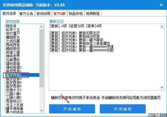 1、在本站下载解压,打开.exe程序,在右侧选择造梦西游2开启辅助;