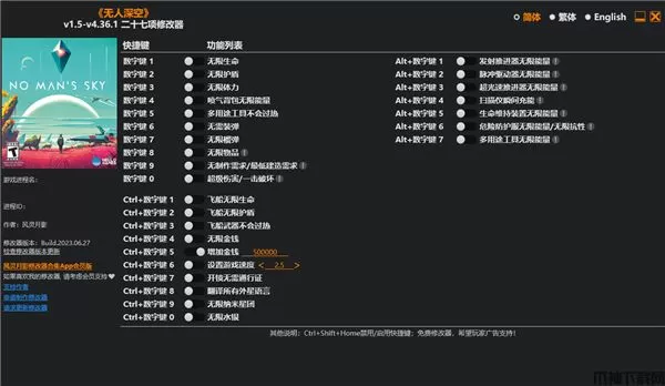 无人深空二十七项修改器是由3DM的风灵月影为同名游戏玩家打造的一款实用修改辅助工具,这款修改器仅适用于1.5版本的游戏,拥有无限生命、无限护盾、无限体力、无限物品、增加金钱、超级速度等多种功能,可以有效地降低游戏的难度,让你游戏起来更加地轻松。无人深空(No Man's Sky)是一款以太空探索冒险生存为主题的游戏。背景设定在一个宇宙的边缘,而玩家的任务就是回归这个宇宙的中心。在游戏中,玩家将自由自在的探索这个新鲜宇宙的全部空间。各种天体和星球一旦被玩家发现就会开始创建,每个都有属于自己独特的环境和完整的生态系统。在《无人深空》游戏中理论上有18,446,744,073,709,551,616颗星球可以供玩家探索,几乎可以看做是无限大。同时因为游戏是使用算法生成星球,所以游戏本身体积不大,而且可以完全离线游玩。但是,由于这是个在线游戏,一旦你发现了这个星球,它就也对其他玩家开放了。玩家对星球的探索不仅仅限于发现,他们还可以给这个星球带来显著的变化,而这些变化也会对后来的玩家产生影响。本站提供无人深空二十七项修改器下载,可以让你更好的体验这款游戏,需要的朋友们赶紧下载使用吧!