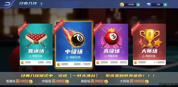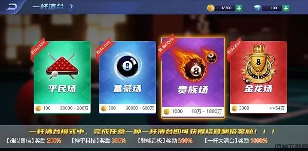 5、丰富多样的关卡,游戏中有多达上百种的关卡,不仅仅有经典的8球模式和斯诺克模式还有各种各样的花式台球。