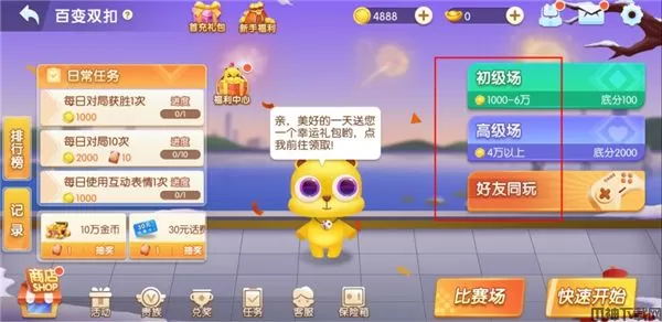 2、其中百变双扣一共有4个房间,但是火拼双扣只有1个房间,而且火拼是2个人对局的,需要有5000以上的金币才可以参与,要求还是比较高的。