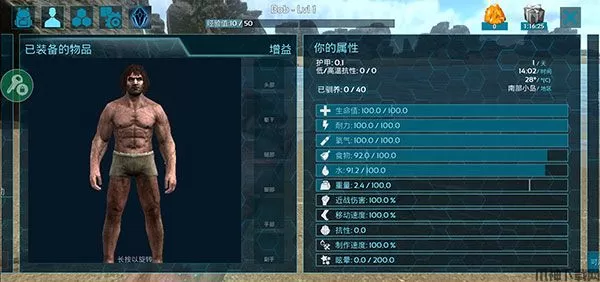 5、可以查看你的属性,如生命值、耐力、食物、水量等等,你应该时刻注意着自己的属性,不然可能会导致游戏的失败;