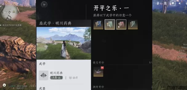 推荐选择“明川药典”,这是唯一的治疗武学,有了它前期所有怪物基本上都可以磨过去