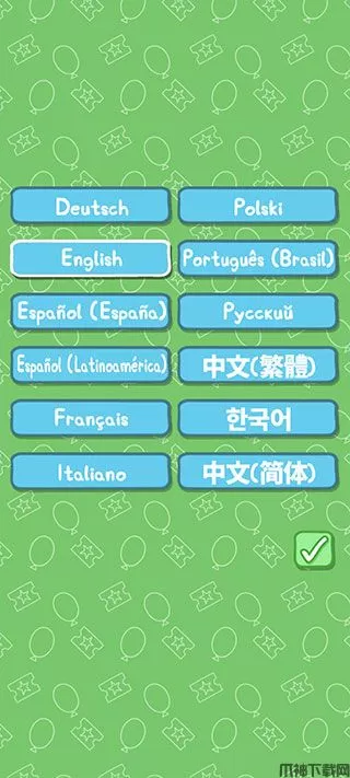 1、进入小猪佩奇主题乐园手机版,选择“简体中文”,点击右下角的对号。
