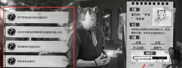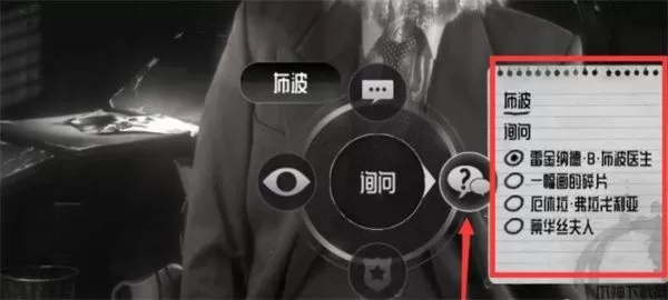 4、点击盘问之后,可以问各种问题,然后根据侦探仪判断对方有没有说谎