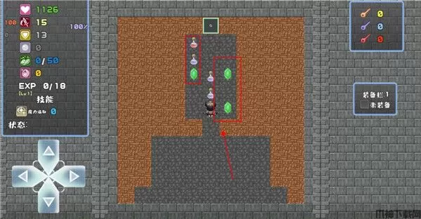 3、地图内会散布各种道具,可以以触碰的方式拾取,像红药水和蓝药水可以恢复补充我们的蓝量