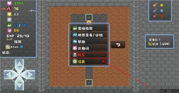 7、当你在探索的时候发现已经打不过任何敌人了,我们可以点击设置选择转生结束这次冒险,然后用结算获得的灵魂升级你的初始属性