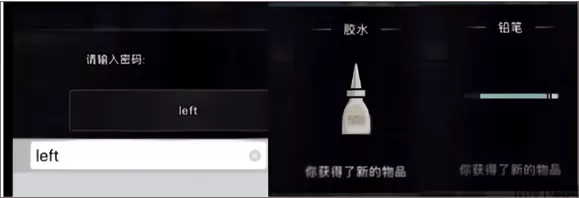 3、左边柜子的颜色与右边操作台颜色相对应,密码输入相对应的字母“left”,打开柜子获得胶水和铅笔;