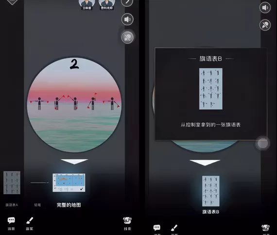 1、左为卫斯里,右为费利克斯,进入房间后,先寻找房间里的东西,左边可以捡到地图碎片和旗语表A,右边捡到旗语表B;
