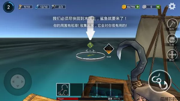 1、最开始的计划,出生时你只有4个板子活动空间加一个钩子,鲨鱼会不定期的咬你的板子,如果你采取不抵抗态度,鲨鱼是不咬烂一块不罢休的。所以尽快用你手头的钩子勾取资源,水上资源分三类: