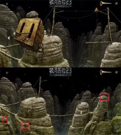5、前往主角家右侧的场景,先去吊台的控制器进行如图操作,连续进行两次把右边的杆子砸断,通路就可以打通。先别急着过,点击图中三个红圈的石头,多点几次可以得到一个音乐。然后前往下一个场景。