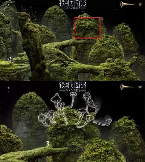 6、先前往红圈处,用喇叭听之后会有很多白色的东西出来,一个个点击全部拔一下,可以变成蘑菇,之后老人会出来采蘑菇。老人开始去削蘑菇了以后,可以再用喇叭对红圈使用,再多喇叭两次拔两次可以得到一个音乐。完成收集后去找蘑菇老人对话,他会给我们一个小游戏要我们完成。