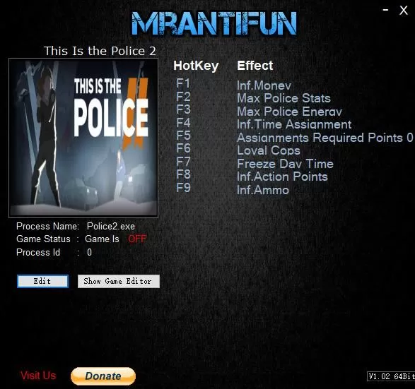 这是警察2修改器是一款专门为同名游戏《这是警察2》而制作的游戏修改器,这款修改器由知名的MrAntiFun设计开发,使用这款修改器可以对游戏的属性进行修改设置,可以根据玩家自己的需要进行修改,支持无限的时间、无限金钱、最大的警察数量设置、进行作业时不会对精力消耗等多种功能,是一款功能强大的、操作简单的修改器,只需要运行游戏和修改器,然后按相应的快捷键即可进行修改,修改之后,玩家可以在游戏中轻松获得胜利,需要的朋友可以在本站下载。