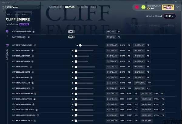 悬崖帝国修改器是由MrAntiFun团队专门针对悬崖帝国(Cliff Empire)开发的简单使用,功能丰富的辅助工具。它是目前市面上最完善、最新的修改器版本,支持悬崖帝国十九项资源修改,包括快速建造、快速研究、增加水,金属,货币,矿物等所有物资,同时,悬崖帝国十九项修改器还能够自动以游戏速度,使用简单,开始游戏后,直接启动本辅助,即可在游戏内直接修改,亲测有效。