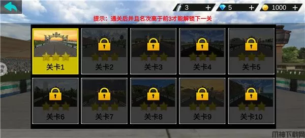 2、选择关卡,一开始只能选择第一关,完成第一关夺得前三名才可以解锁后面的关卡。