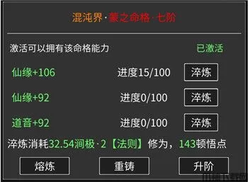 6、每个命格拥有三条属性,每条属性 都可以通过消耗顿悟点和修为的方式来实现升级。每个命格属性进度都是0/100,淬炼可以提高单条属性值,有的淬炼一次有效果,有的需要淬炼多次,具体规律还在摸索中。(ps:重铸不影响淬炼)