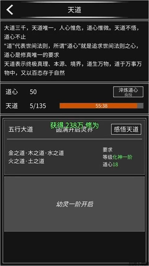 1、天道:通过每天上线的方式获得道心,用于领悟天道,然后限制飞升下一个界面等级。