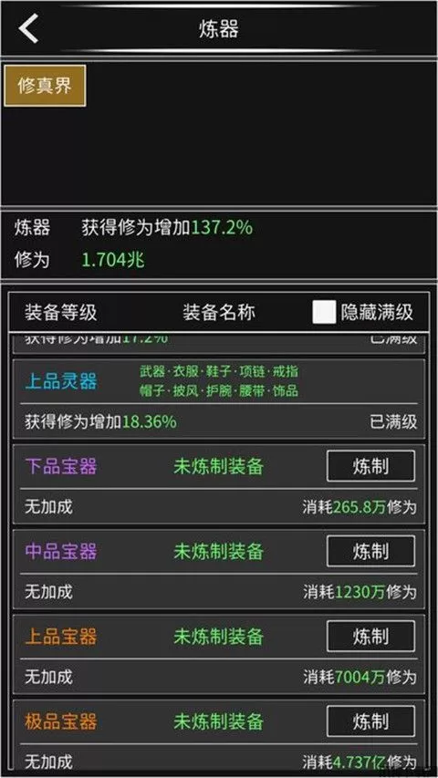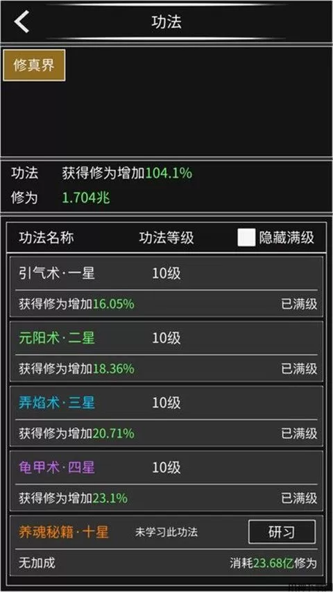 3、修炼:修真界所有修炼体系都在这里体现,简单的使用修为升级来提高修为速度,道心,仙缘。
