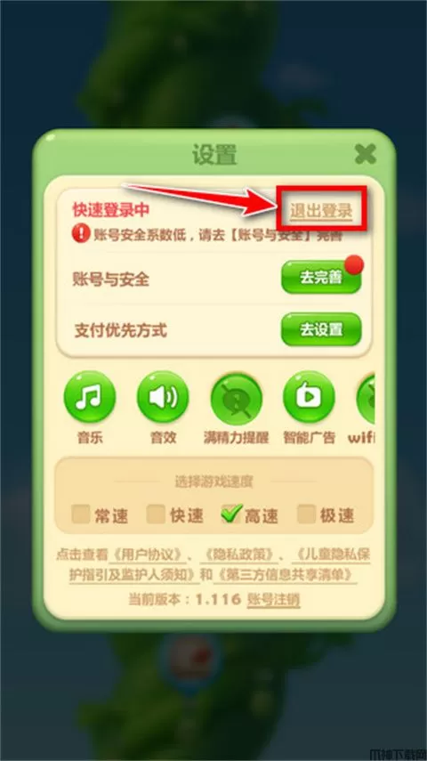 2、在开心消消乐的设置中,选择“账号与安全”一项,点击退出登录即可切换账号;