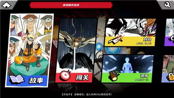 1、打开真死神VS火影绊游戏,进入游戏模式选择,可选择故事模式、闯关模式、对战模式、训练模式;
