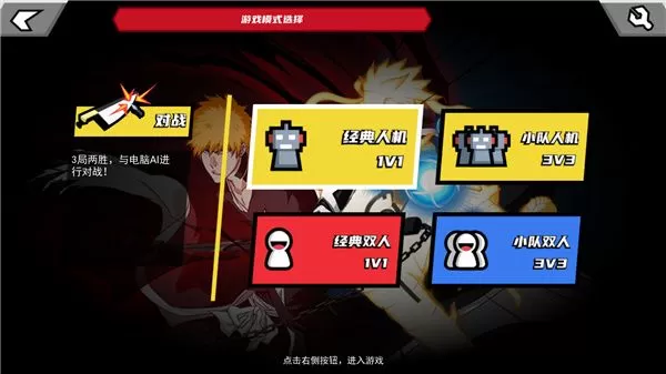 2、点击对战可选择经典人机、小队人机、经典双人和小队双人,人机对战三局两胜,与电脑AI进行对战;