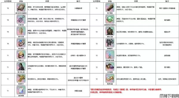 部分防具还额外提供了防具技能,比如晶石巨盾,主动使用后携带者可以获得额外护盾。以下是目前游戏中所有防具的特效和实用等级,其中标注T0的,都是效果好、泛用性强、实用的优质防具;T1类别的是特效还不错,有一定泛用性的防具;T2类别的则是特效相对一般的防具。