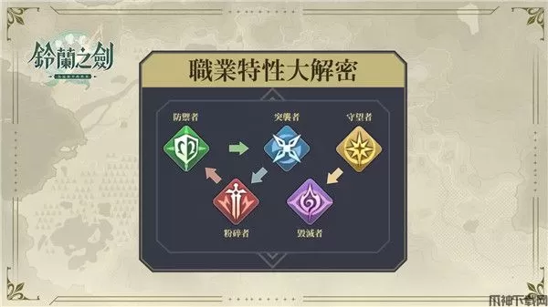 游戏中,每位角色都带有各自的职业特性。官方表示,游戏中共有“粉碎者”、“守望者”、“防御者”、“突袭者”、“毁灭者”五种职业,每种职业都拥有对应剋制的职业,以及其风格迥异的战斗风格,玩家将可以巧妙的运用职业特性,创造己方极大的战略优势。