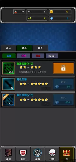 7、游戏商店里面还有普通武器和高级武器,当然是要等到一定等级才能够购买;