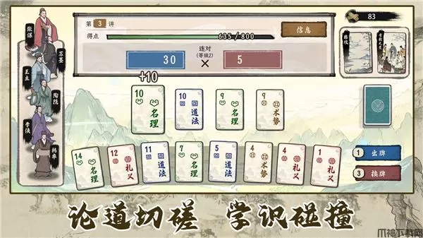 诸子百家模拟器是一款模拟人生手游,因周朝衰落,诸侯之间开始争霸,形成百家争鸣的局面,玩家将扮演该时期周游列国的游士,前往各国传道与百家宗师传道辩论,开创自己的学派。诸子百家模拟器游戏通过卡牌对战的方式进行思想辩论,玩家需要从随机手牌中选出组合牌型获得得点,在特定出牌次数中达到目标得点,即可通过关卡。在诸侯国传道成功后,便能获得周游列国的状态,此状态能提升后续传道的收益。玩家可以在部分诸侯国中招揽弟子,按照弟子的礼、乐、御、射、书、数共六艺属性,派去参与随机事件,可让他们得到经验成长,欢迎有需要的朋友在本站免费下载!