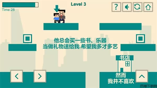 第六关:父亲先把箱子弄到书店下面,记住要比较靠外边,然后领到书再用二段跳上去。多尝试一下就行了!
