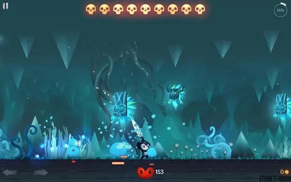 本作属于典型的横版动作过关类型。本作是由 Hexage 自主研发的游戏开发工具进行制作,但无论是游戏的光影效果,还是动作的流畅性,都展现了超高的水准。而且这次 Hexage 没有选择惯用的复古视觉效果,而是以卡通化的视觉效果进行包装,从玩家扮演的主角「黑剑客」即可看出,游戏角色的塑造上整体偏向卡通化,营造出了可爱范儿。音乐方面没有选用大气的类型来衬托动作风味,反而是选用了略带紧张和神秘的音乐,搭配效果并不违和,算是中规中矩吧!音效上的表现则颇为亮眼,爽利的打击音效很好地诠释了「刀刀入肉」的视觉感。