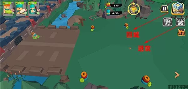 5、备战完毕后,点击左边的进攻按钮,如果地方火力太猛,可以选择回城进行防御。
