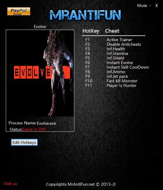 F1 激活修改 F2 关闭修改 F3 无限生命 F4 无限耐力 F5 无限盾牌 F6 瞬间进化 F7 瞬间技能冷却 F8 无限子弹 F9 无限火箭包 F10 一击必杀 F11 玩家是猎人
