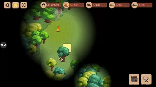 3、如下图放置火把就可以照路范围区域,点击右下角的武器选择树木就可以收集资源;