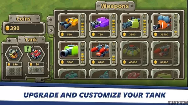 2、收集硬币以升级坦克的属性,购买和改进武器。